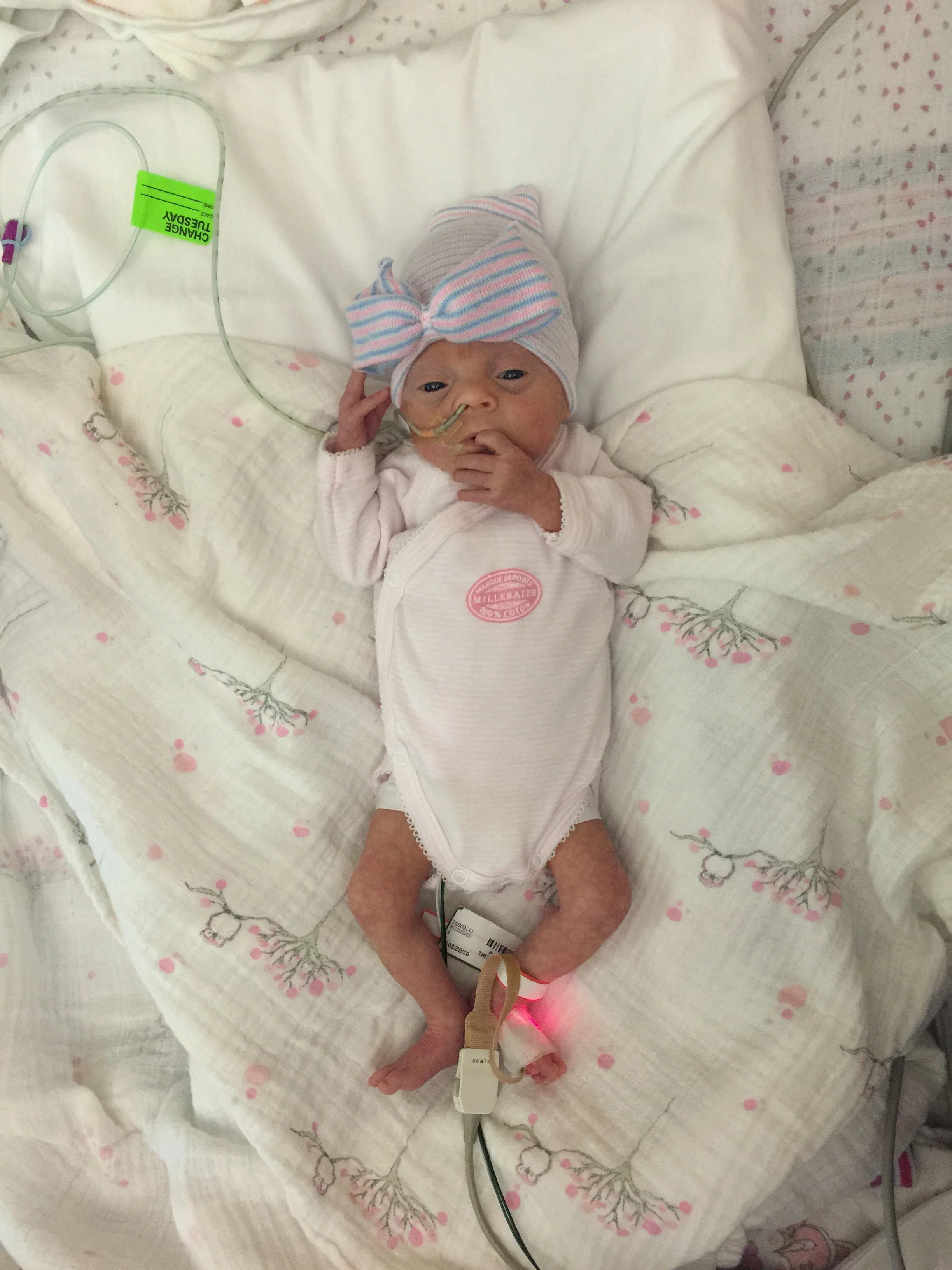 Speaking of, we moved Charlotte to a side-lying position today and also transitioned to a preemie, slow flow nipple. Apparently, she liked those changes because she showed that she is actually capable of rocking the suck-swallow-breathe pattern when she wants to do so. She took over half of her feed without dropping below 96% O2 saturation. However, it took a fair amount of energy and time to get the milk out of that slow flow nipple, so after that time (about 20-25 minutes), we opted to let her rest and get the remainder via her tube.