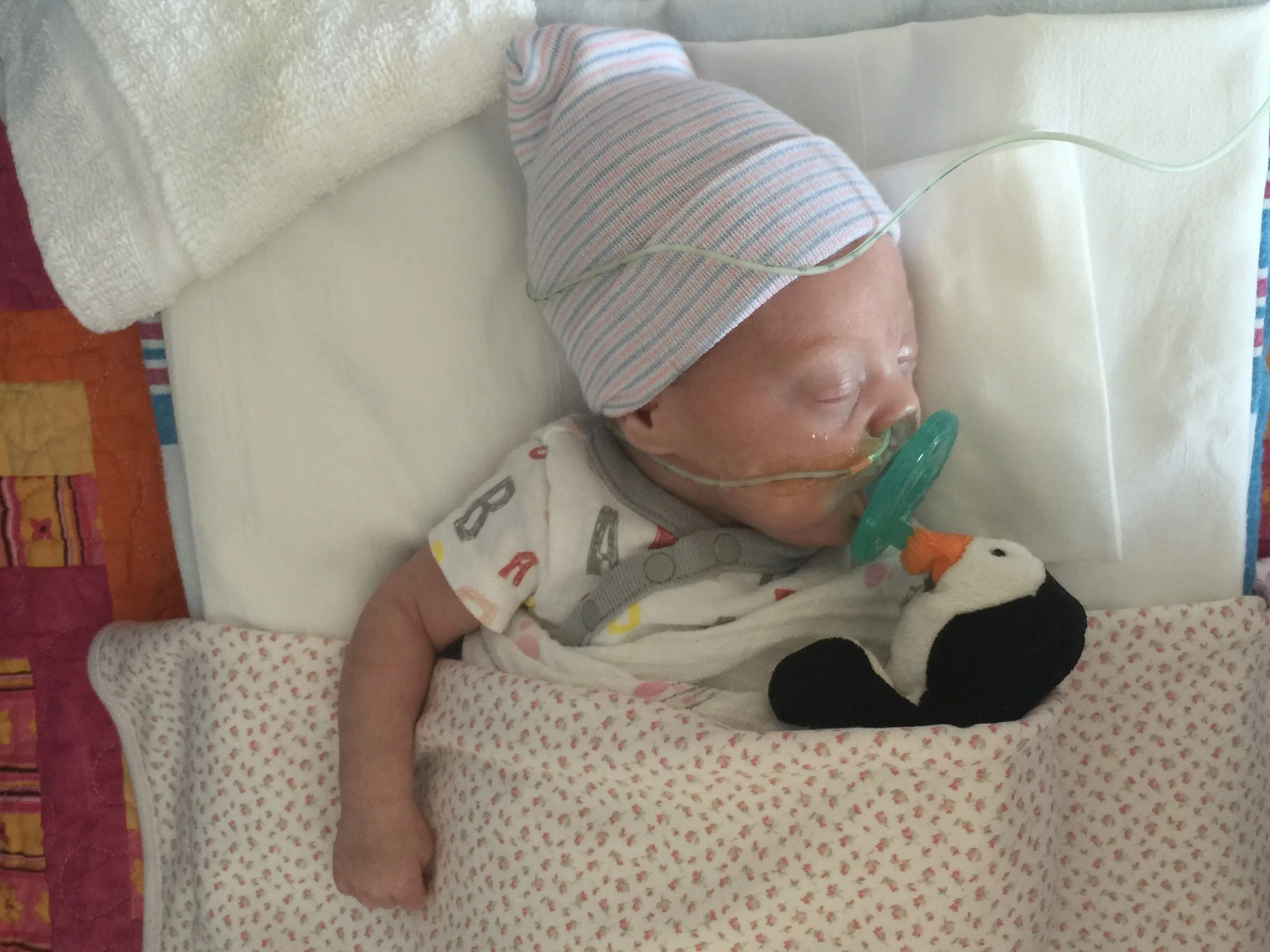 Audrey has had mild stage 2 for the last two exams, so we'll see how she looks this coming Tuesday at her next exam. She is basically 5lbs at this stage. Although she's the smallest, she still seems to have the lead in the race to discharge. She's eating well, finishing her bottle at every other feed, and will likely start to take even more of her milk via a bottle before long. She still has a bit of tachycardia on occasion, but for the most part, all of her statistics (heart rate, oxygen saturation, respiratory rate...) are stable and good. It will be so strange to NOT have a monitor on these babies at home.